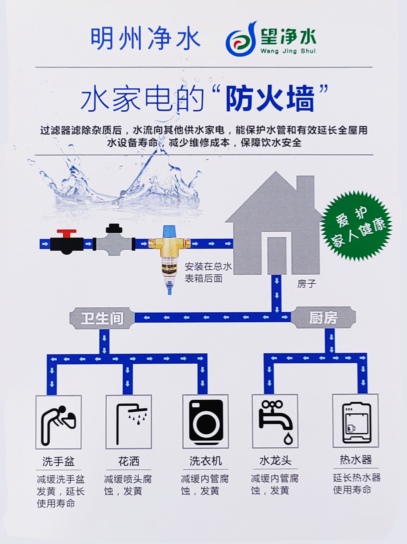 過濾器濾除雜質后,水流向其他供水家電,能保護水管和有效延長全屋用水設備的壽命,減少維修成本,保障飲水安全。 ...